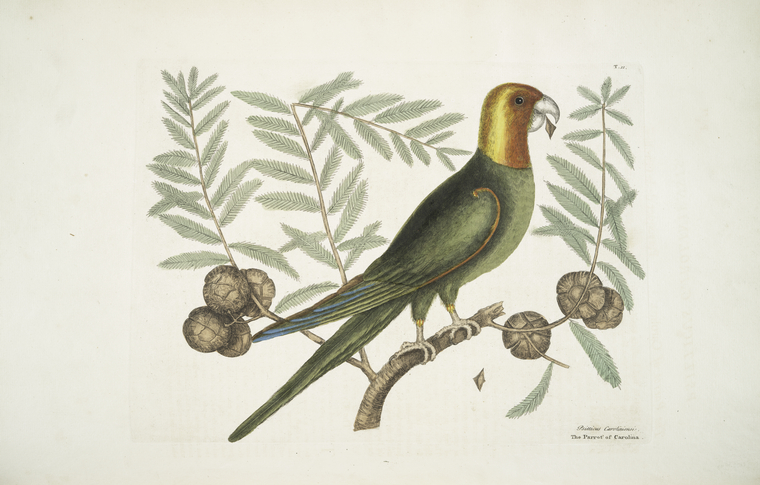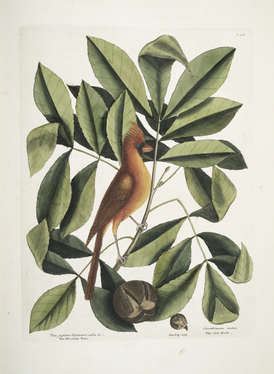 Nux juglans Virginiana alba &c., The Hiccory Tree; The Pig-nut; Coccothraustes ruber, The red Bird.