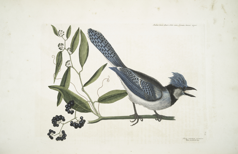 Smilax loevis Lauri folio non Serrato, baccis nigris, The Bay-leaved Smilax ; Pica cristata carulea, The crested Jay.