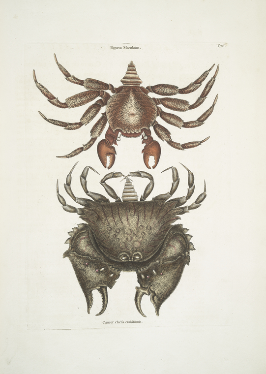 Pagurus Maculatus, The res mottled Rosk-Crab; Cancer chelis crassissimis, The rough-shell'd Crab.