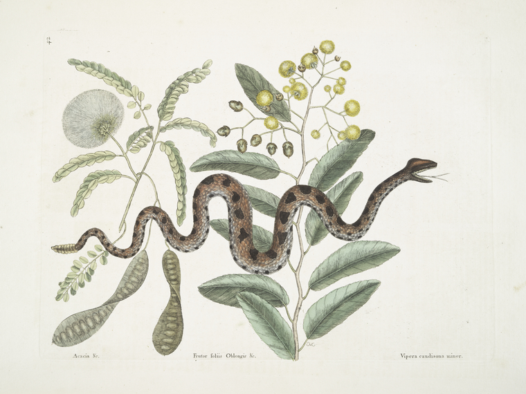 Acacia &c., Frutor [Frutex] foliis oblongis &c.; Vipera caudisona minor, The Small Rattle-Snake.