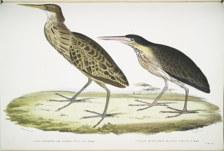 1. Cinnamon Heron, Ardea cinnamonea; 1. Yellow necked Heron, Ardea flavicollis.