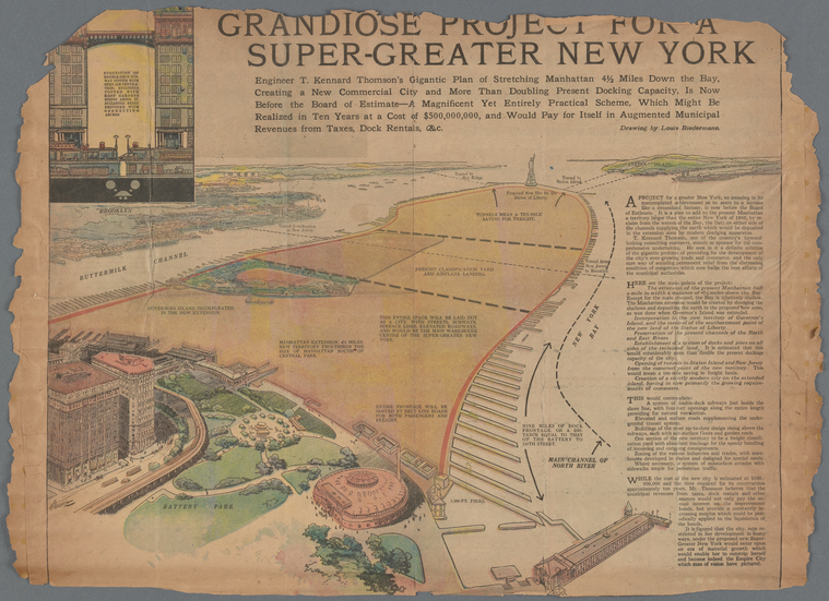 1918. Scrap book containing newspaper and magazine clippings concerning the project to extend Manhattan Island some six miles south of the Battery.
