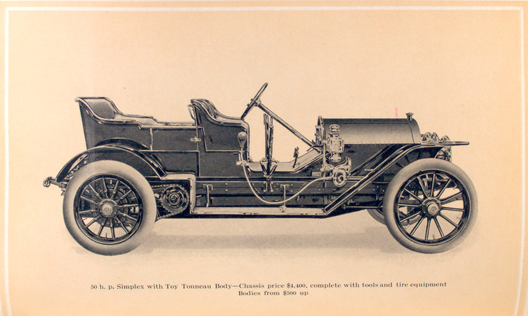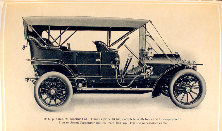 50 h.p. Simplex Touring car - chassis price $ 4,400, complete with tools and tire equipment; Five or seven passenger bodies, from $ 800 up - top and accessories extra.